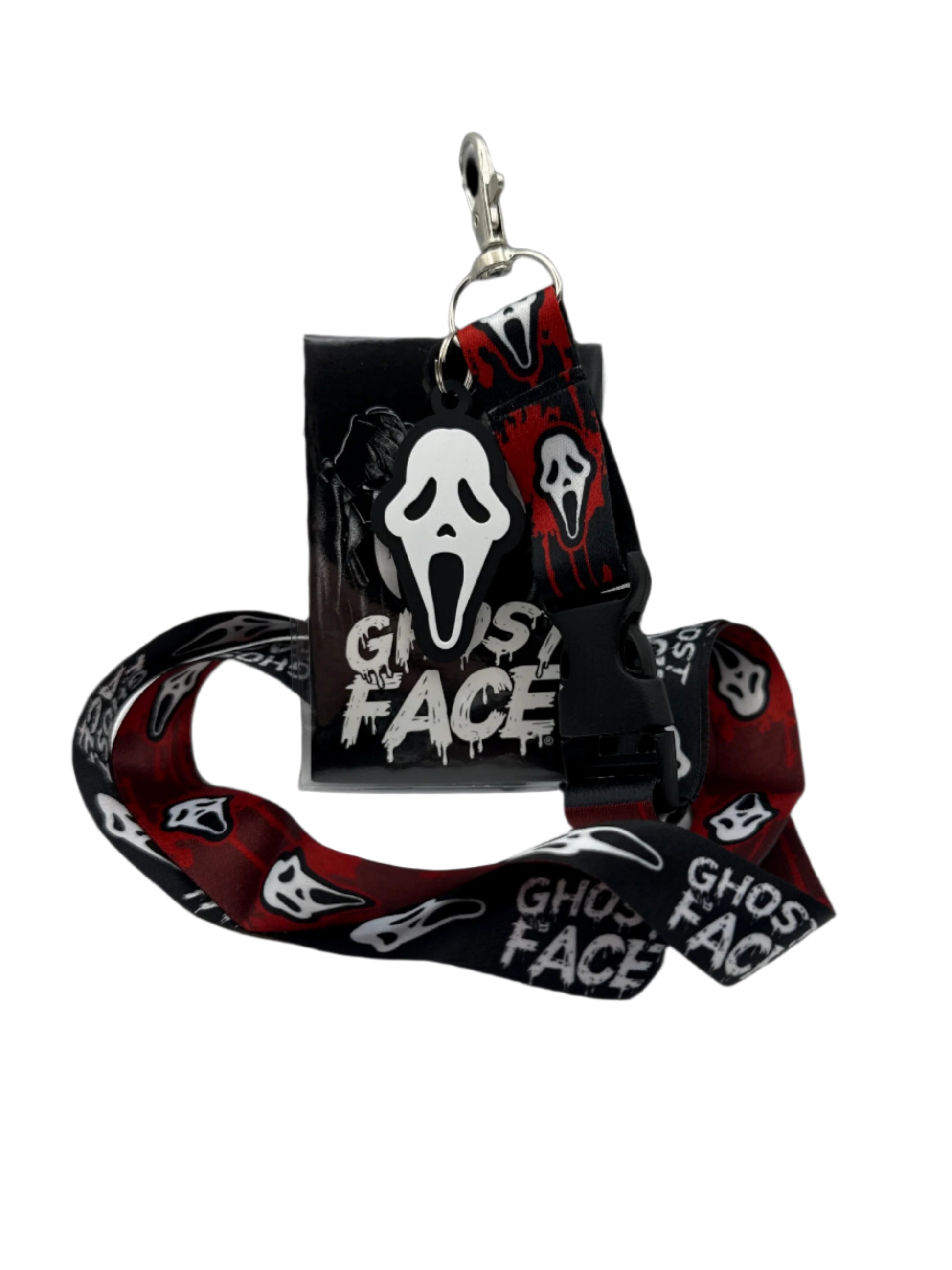 Whether you're headed to work, class, or your next horror con, this Ghostface lanyard keeps your badge, keys, or ID locked down in slasher style. Comes with a matching card sleeve and a breakaway clasp for safety.