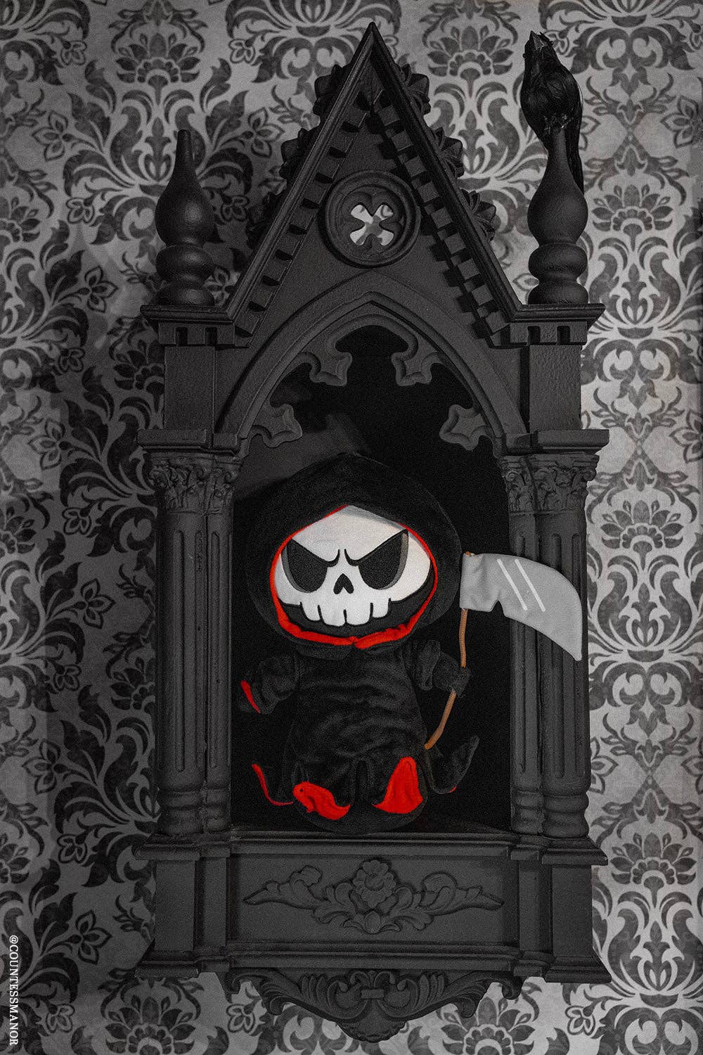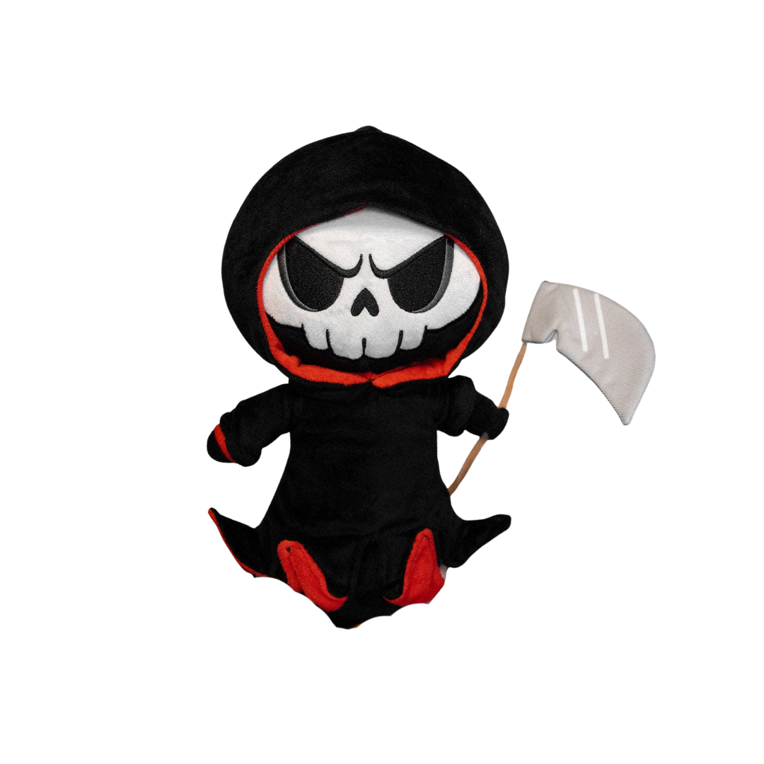Meet your new spooky sidekick: the Grim Creeper Plush Toy. With a wicked embroidered skull, blood-red cloak accents, and a posable scythe, this reaper means business—soft, sinister business.