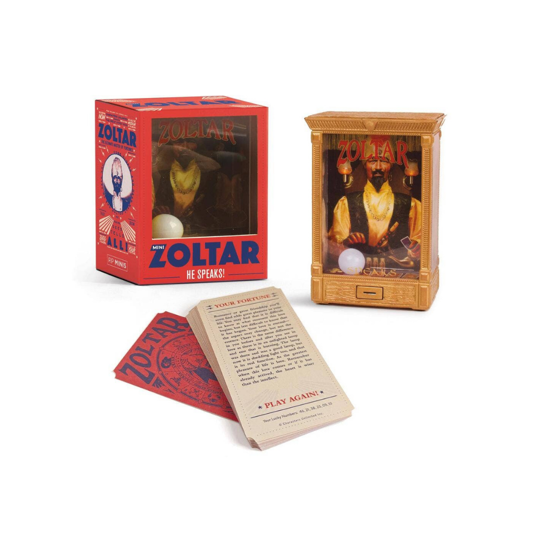 Inspired by everyone's favorite all-knowing animatronic fortune teller, this one-of-a-kind, mini-size talking Zoltar brings his fortune-telling wisdom to your home or office. ·Specifications: 4" replica of the iconic animatronic fortune-teller, Zoltar, printed on clear plastic and housed within his booth ·With Sound and Light: At the press of a button, Zoltar speaks a handful of wise fortunes while the lights on his booth flicker and his crystal ball lights up ·Fortune Cards Included: 16 fortune-telling cards to lend words of wisdom and advice ·Portable: Small size allows for fun anytime, anywhere ·Officially Licensed: An authentic Zoltar collectible