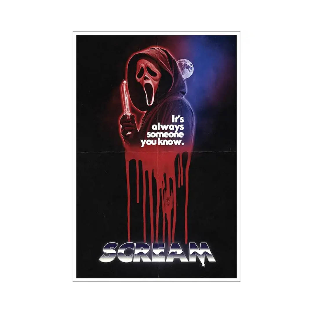 Do you like scary movies? This Scream poster features Ghostface in chilling glory. Perfect for horror fans or spooky décor.