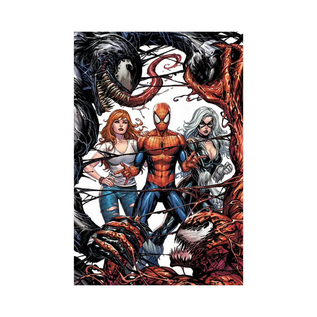Things just got tangled. Spider-Man’s caught in the chaos between two of Marvel’s most savage symbiotes — Venom and Carnage — with Mary Jane and Black Cat standing their ground by his side. This 24x36 poster is a full-blown, web-slinging war zone for your wall.